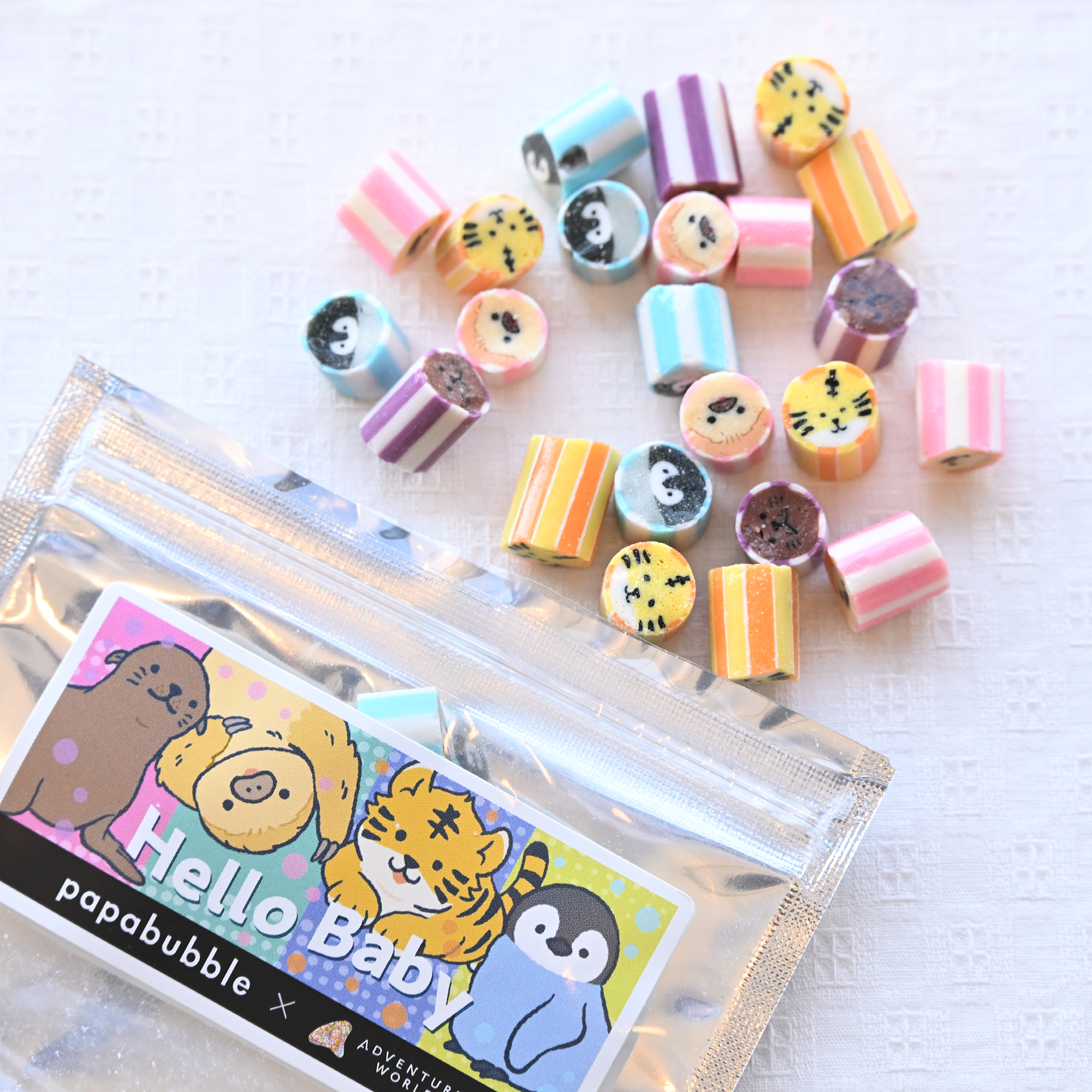 その職人技を活用し、アドベンチャーワールドで近年誕生した赤ちゃん動物4種(フタユビナマケモノ、エンペラーペンギン、カリフォルニアア シカ、アムールトラ)の顔をモチーフにしたオリジナルキャンディです!