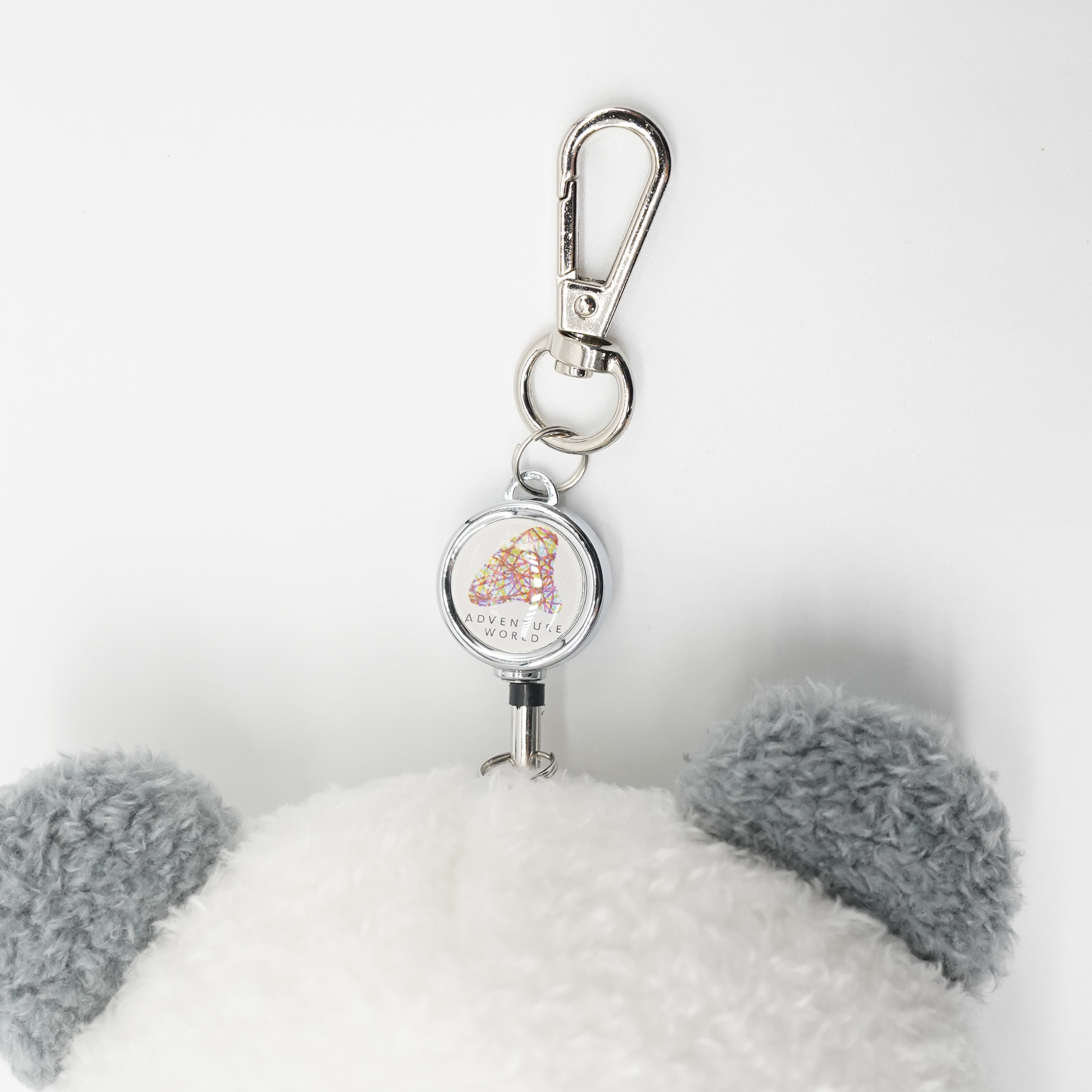もこもこパンダの背中にはチケットホルダー、頭にある金具はリールになっており、伸び縮み自在!