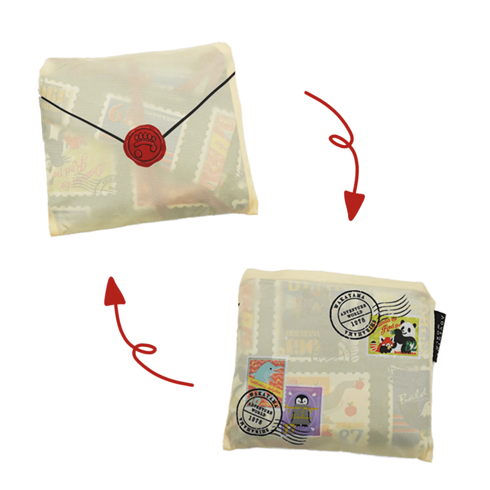 パークで暮らす仲間たちがかわいい切手に!小さくたためるポケットが便利で、ショッピングバックに最適です。小さくたたむと手紙になるデザインで持ち歩くのも楽しくなります!
